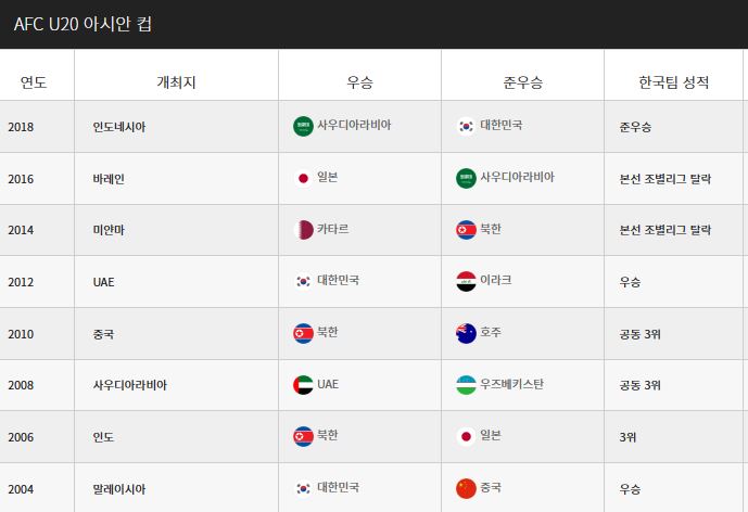 AFC 20세 이하 축구 국가대표팀의 성적을 보면 매번 우승을 못했을 뿐 항상 상위권에 입상하는 기록을 보유하고 있지만 최근 우승기록이 없는 점이 다소 아쉬운 부분입니다.