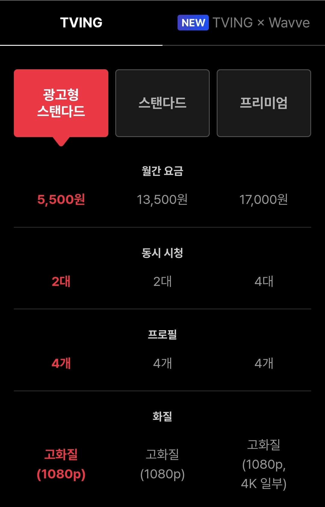 TVING 이용권 구매 금액은 광고형 스탠다드 기준 월 5,500원이고 동시 시청 대수 등에서 더 많은 혜택이 있는 스탠다드 (13,500원), 프리미엄 (17,000원) 요금제도 준비되어 있으니 관련 내용 확인해 보시기 바랍니다.